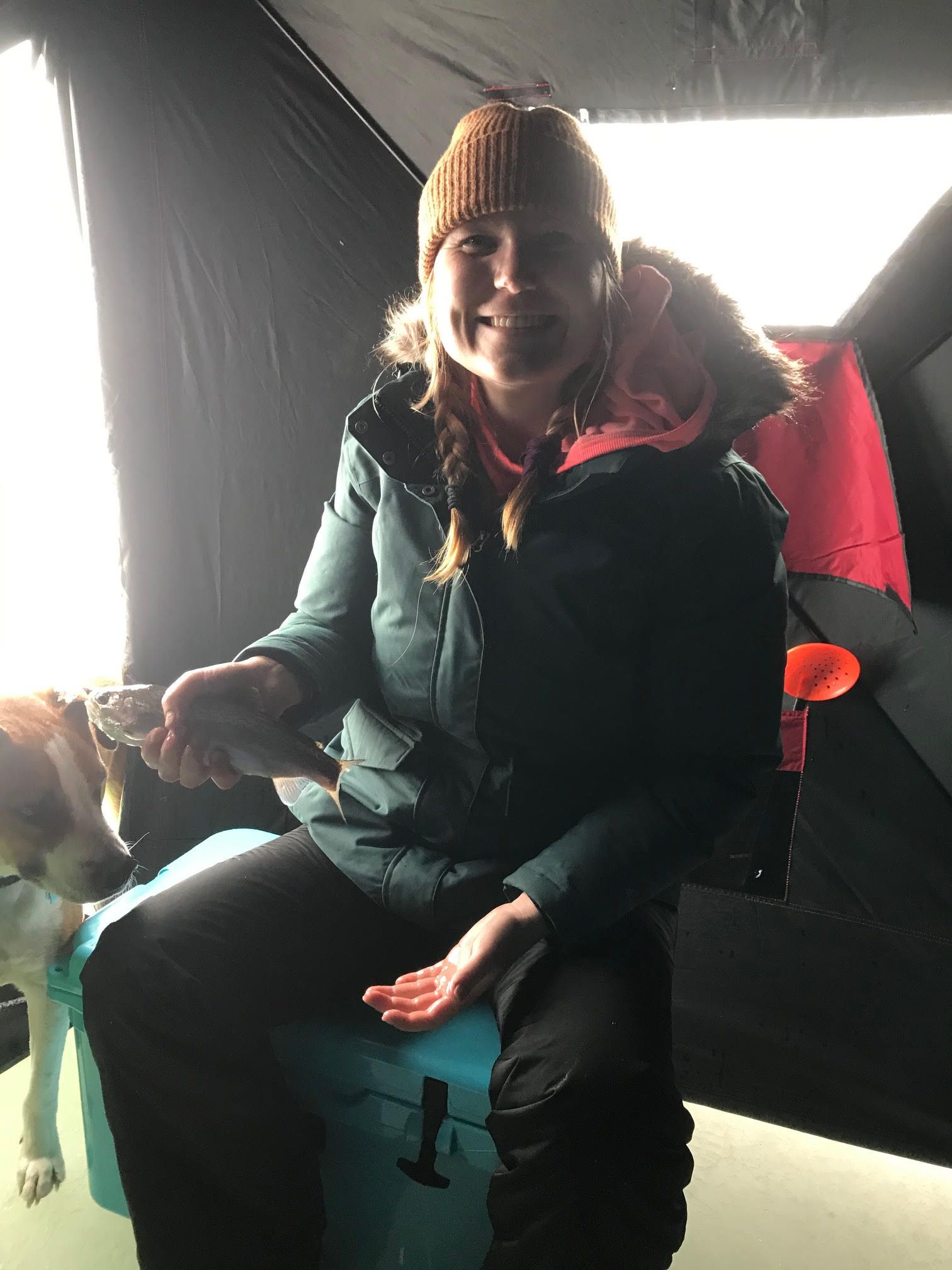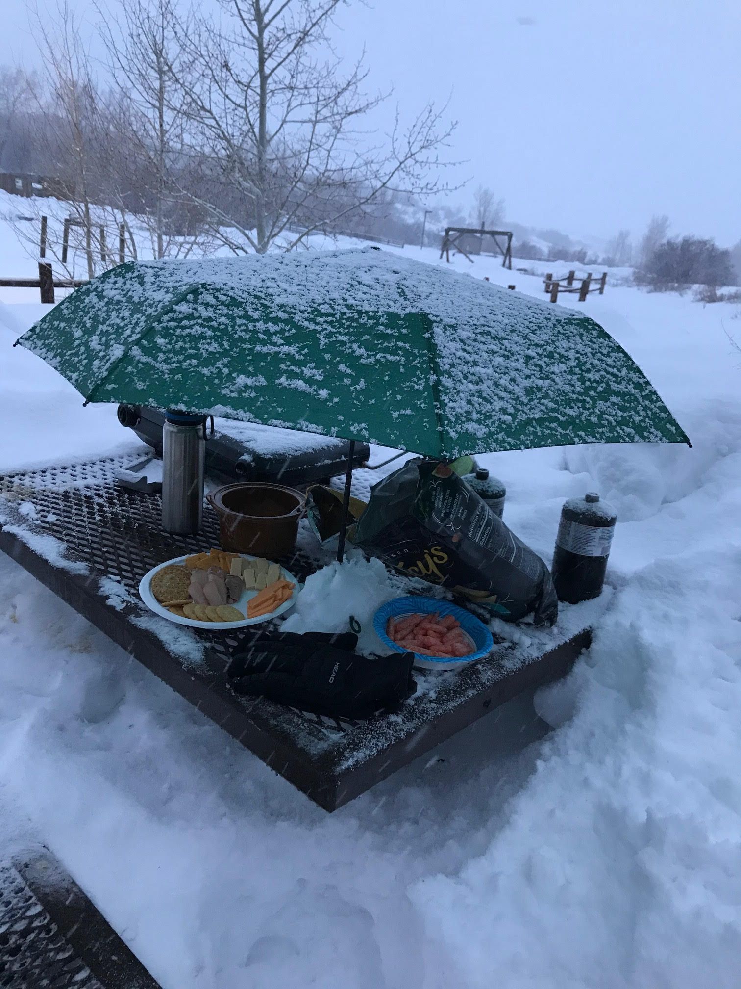 The snow would come in bands and varied from light to heavy. Most everyone caught or hooked a fish and MLW even admitted ice fishing was bearable in my ice fishing tent. Then we decided to go back to the vehicles and the slog began again in reverse. We made our way back to the cabins changed our clothes and in a rather heavy snow storm had a campfire and happy hour.