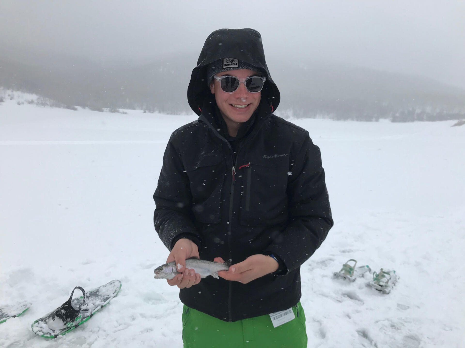 After lunch our group packed up to ice fish. We soon learned that access to the “secret spot” where we were told the fish were was far from easy. First of all, reservoirs like Vega are at their lowest point this time of year, so the water was not near the boat ramp, no, far from it. Then add in that snow that was deep and fun the previous day and it was rather tough to get out to the water loaded down with gear and wearing snow shoes again. We finally got out on the water after a 6/10’s of a mile slog and got settled.