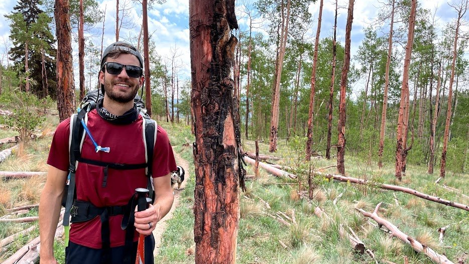 We broke camp then had a nice breakfast sitting overlooking the lost park valley. Shortly thereafter we packed up and were off. We traveled about 2 miles when we noticed the aspen trees we were walking through had a weird red tint. With some investigation we noticed it wasn’t natural. We saw it had drip marks and it came from a specific direction. Some of you may have already figured out what we found, but we were walking through a section of trees that had at some time, and not this year, had fire retardant dropped on it during a forest fire.