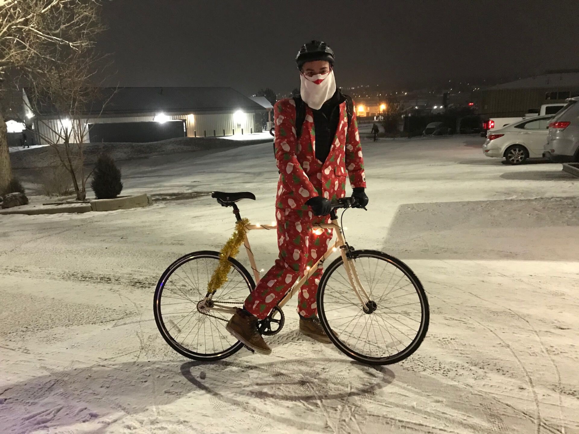 As we rode in the cold air with our Santa masks on, our faces were actually warm. For the first time since the pandemic started I found an actual comfort advantage to wearing a mask. As we rode down the road, we were met with waves and occasionally friendly honks to our parade of decorated bikes, flashing lights, christmas music and Santa masks.